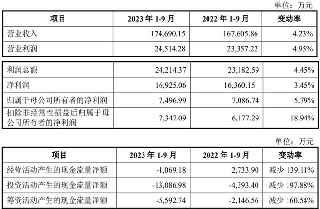 2023年1-9月,安邦护卫告终买卖收入174,690.15万元,同比伸长4.23%;告终归属于母公司一切者的净利润7,496.99万元▲,同比伸长5.79%;告终扣除非往往性损益后归属于母公司一切者的净利润7,347.09万元▲,同比伸长18.94%;规划勾当形成的现金流量净额-1,069.18万元▲▲,同比删除139.11%。