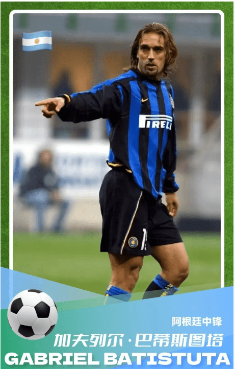 加夫列尔·巴蒂斯图塔:行动二十世纪九十年代天下足坛的顶尖弓手,加夫列尔·巴蒂斯图塔仰仗着本身的势力▲,助助阿根廷队和佛罗伦萨获得了众座冠军奖杯,因而被球迷尊称为“战神”。