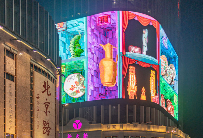 广州市越秀区北京道步行街,新大新百货的裸眼3D浮现了越秀区与广州市的汗青生长,海上丝绸之道的光芒▲,以及广府文明特质文明元素